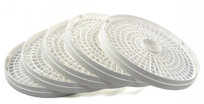 - Пять съемных поддонов позволяют одновременно сушить до 1,5 кг продуктов (например, 5 этажей яблочных долек толщиной 2–3 мм).