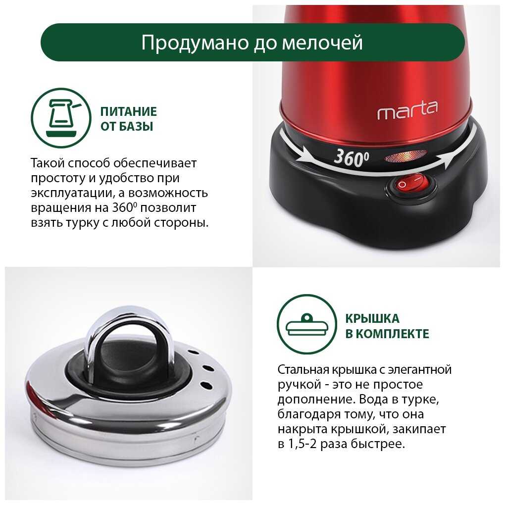 - Съёмная конструкция (турка + база) упрощает переноску и хранение.