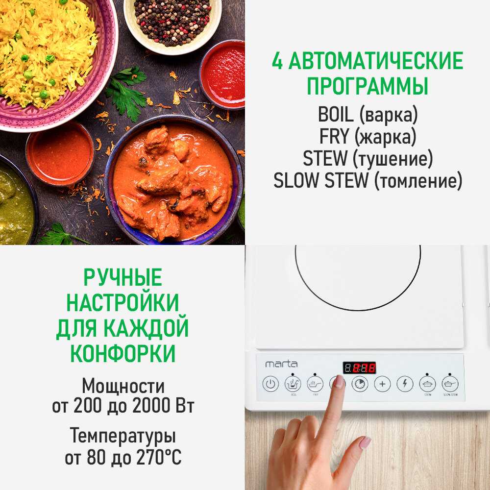 Плита нагревается очень быстро, вода закипает почти мгновенно, блюда готовятся равномерно и быстрее, чем на обычной плите. Конфорки мощные, с точной регулировкой температуры и мощности. Пользователи хвалят это за удобство в динамичной семье или на даче. Однако плавный переход между низкими температурами (500-800 Вт) не всегда удобен, приходится переключать режимы. -