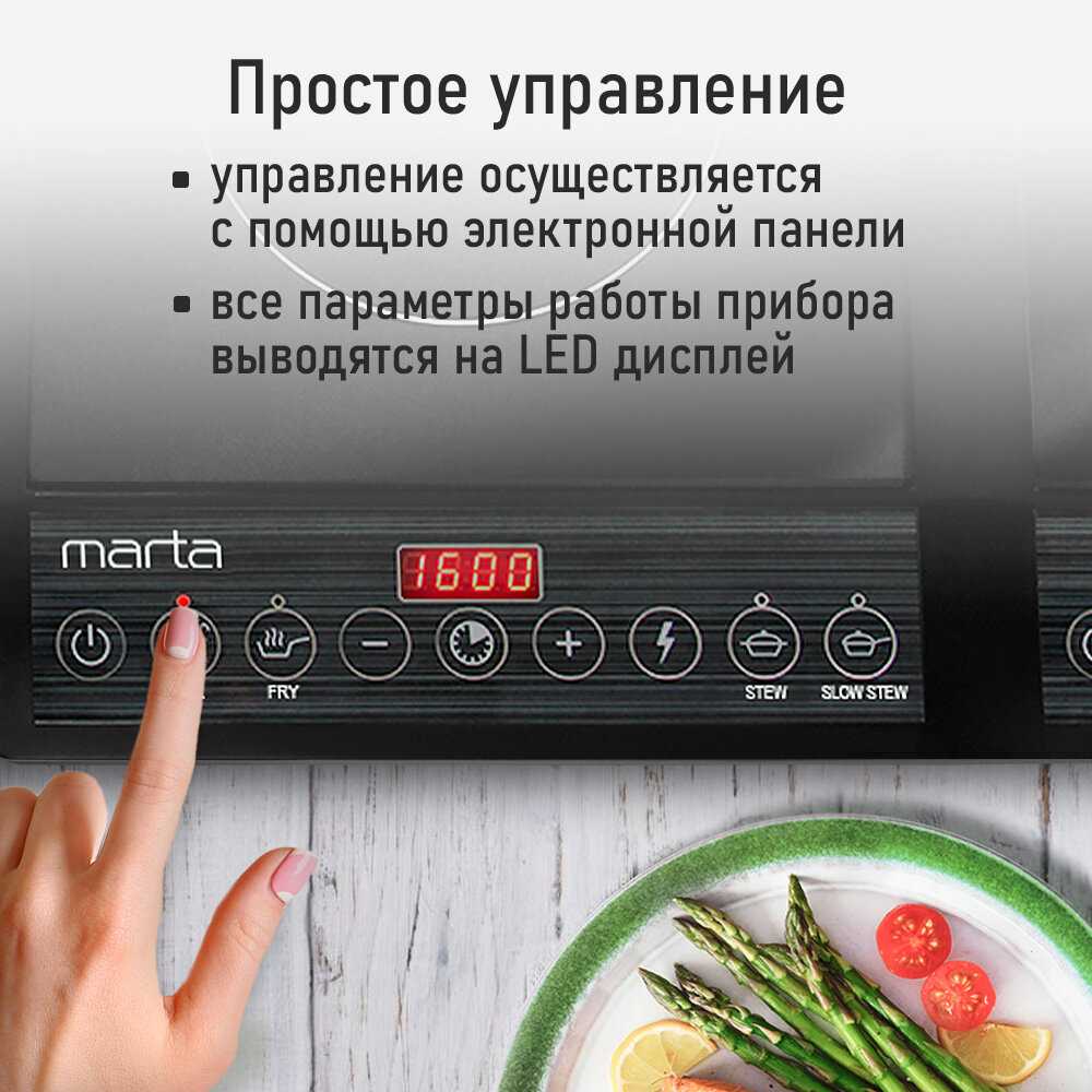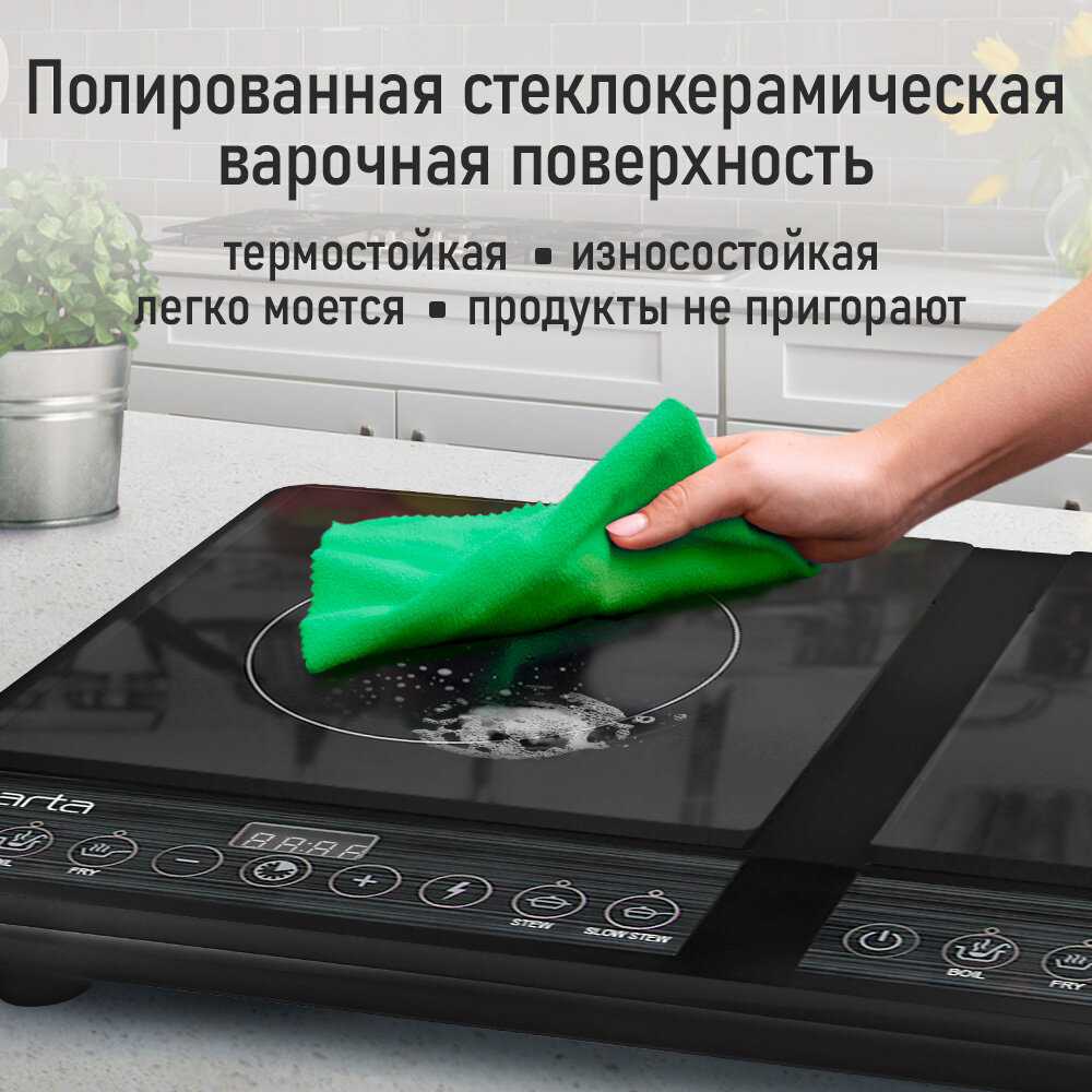 - Потребляет меньше энергии по сравнению с традиционными электроплитами благодаря точечному нагреву.