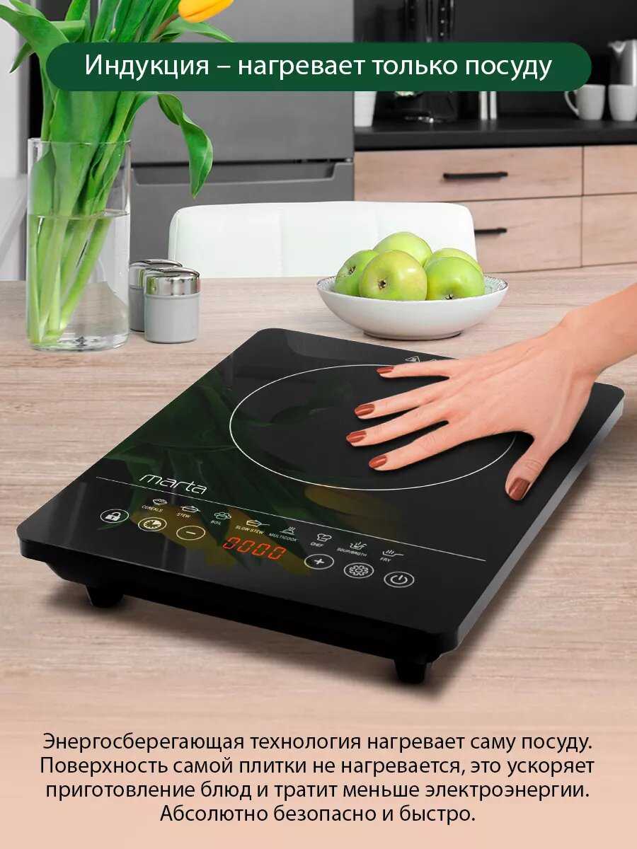 Пользователи выделяют: экономию времени за счет быстрого нагрева, энергоэффективность (нагрев только посуды, а не конфорки), компактность и легкость (вес около 3 кг). Отсутствие открытых нагревательных элементов упрощает уход и снижает риск возгорания. -