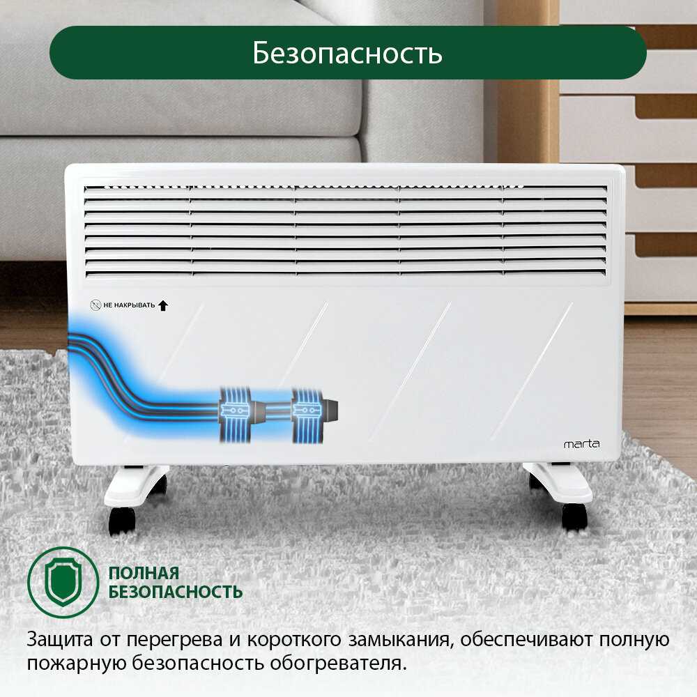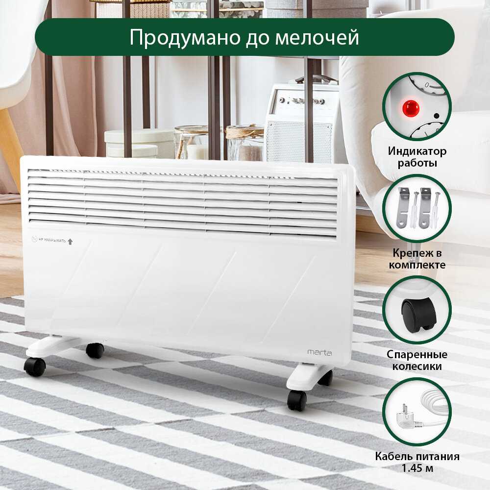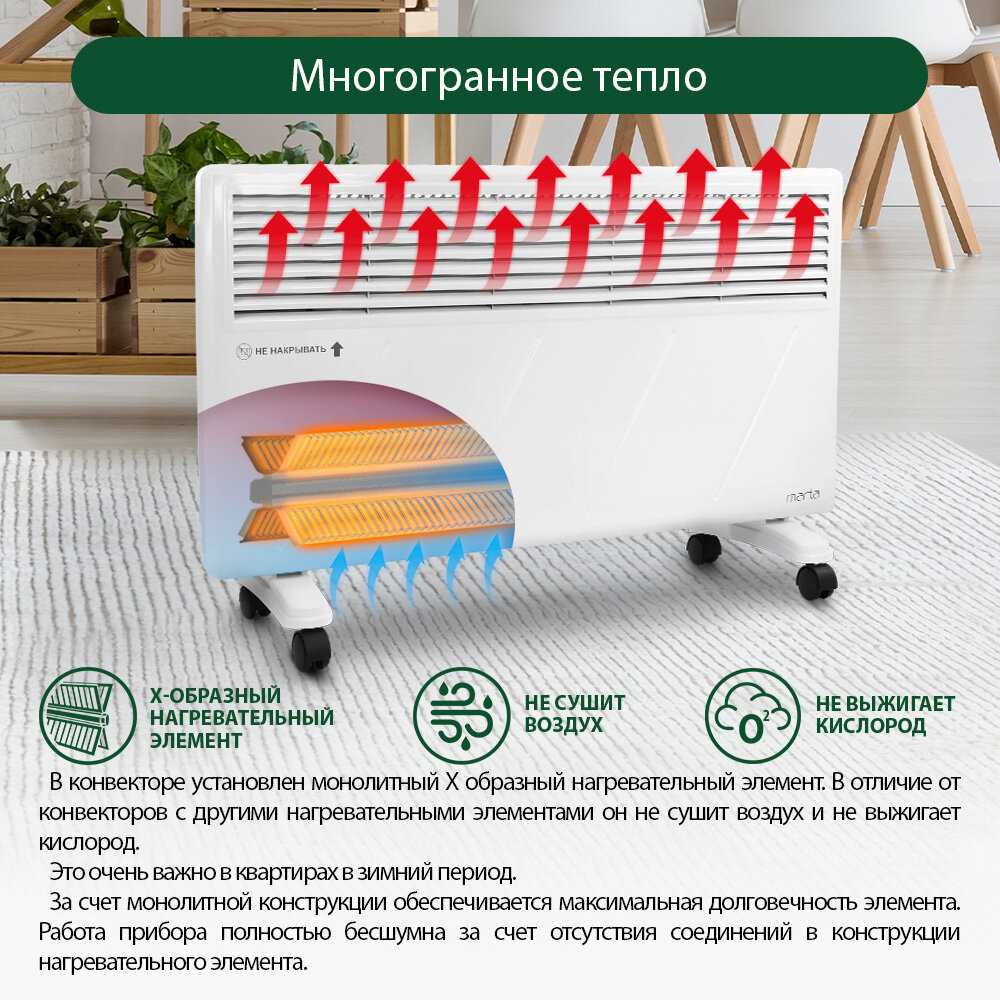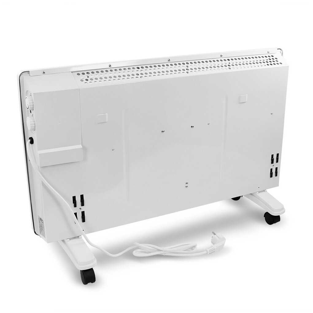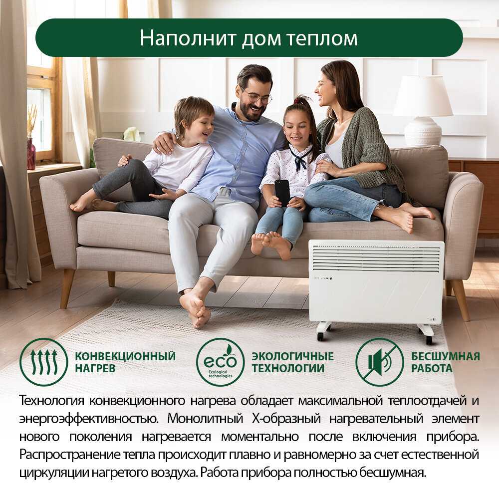 - Конвекционный принцип работы равномерно распределяет тёплый воздух, избегая локальных перегревов и создавая комфортный микроклимат.