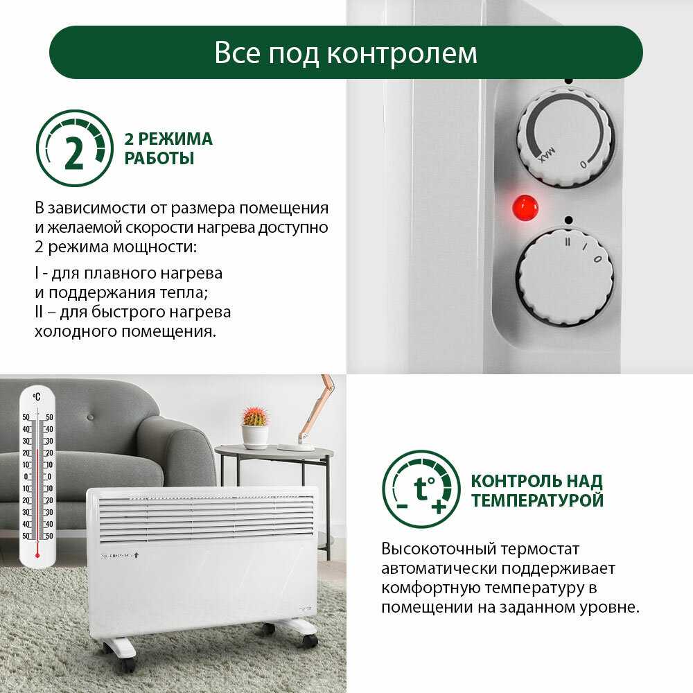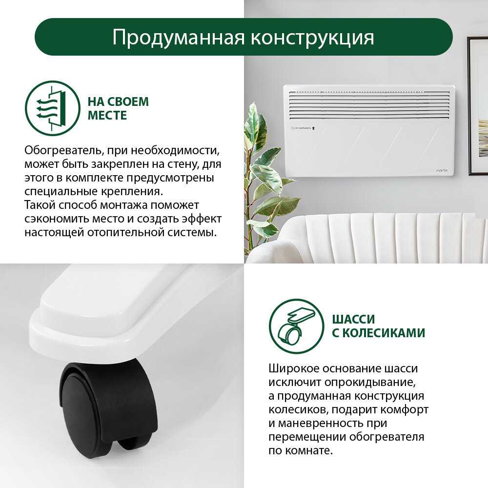 - Конвекционный принцип работы равномерно распределяет тёплый воздух, избегая локальных перегревов и создавая комфортный микроклимат.