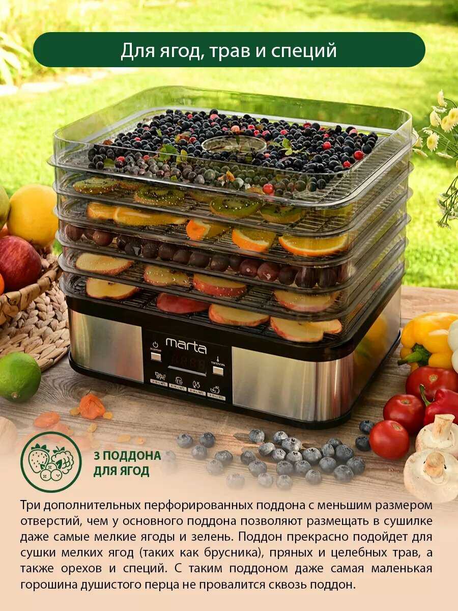 Удобство использования и функциональность: Устройство позиционируется как многофункциональное, с возможностью сушки фруктов, овощей, грибов, трав, мяса, приготовления пастилы и йогуртов, что удовлетворяет потребности разнообразной домашней заготовки. Управление осуществляется через цифровой интерфейс с таймером и регулировкой температуры в диапазоне до 70°C, однако некоторые пользователи выражают сомнения в точности поддержания заявленной температуры, сравнивая с духовками с конвекцией. Комплектация включает до 9 уровней: 7 стандартных поддонов для сушки и 2 специализированных для пастилы, но отмечаются случаи несоответствия комплектации — отсутствие одного или обоих поддонов для пастилы, а также сеток для ягод и трав, которые могут иметь нестандартные размеры, затрудняющие замену. Прямоугольная форма поддонов считается более практичной по сравнению с круглыми аналогами, но их малая глубина требует размещения через один при обработке объемных продуктов. Таймер оснащен звуковым сигналом, который описывается как громкий и продолжительный, что может disrupt ночные циклы работы. Мытье поддонов оценивается как легкое, а компактные размеры устройства позволяют удобно хранить его в условиях ограниченного пространства.