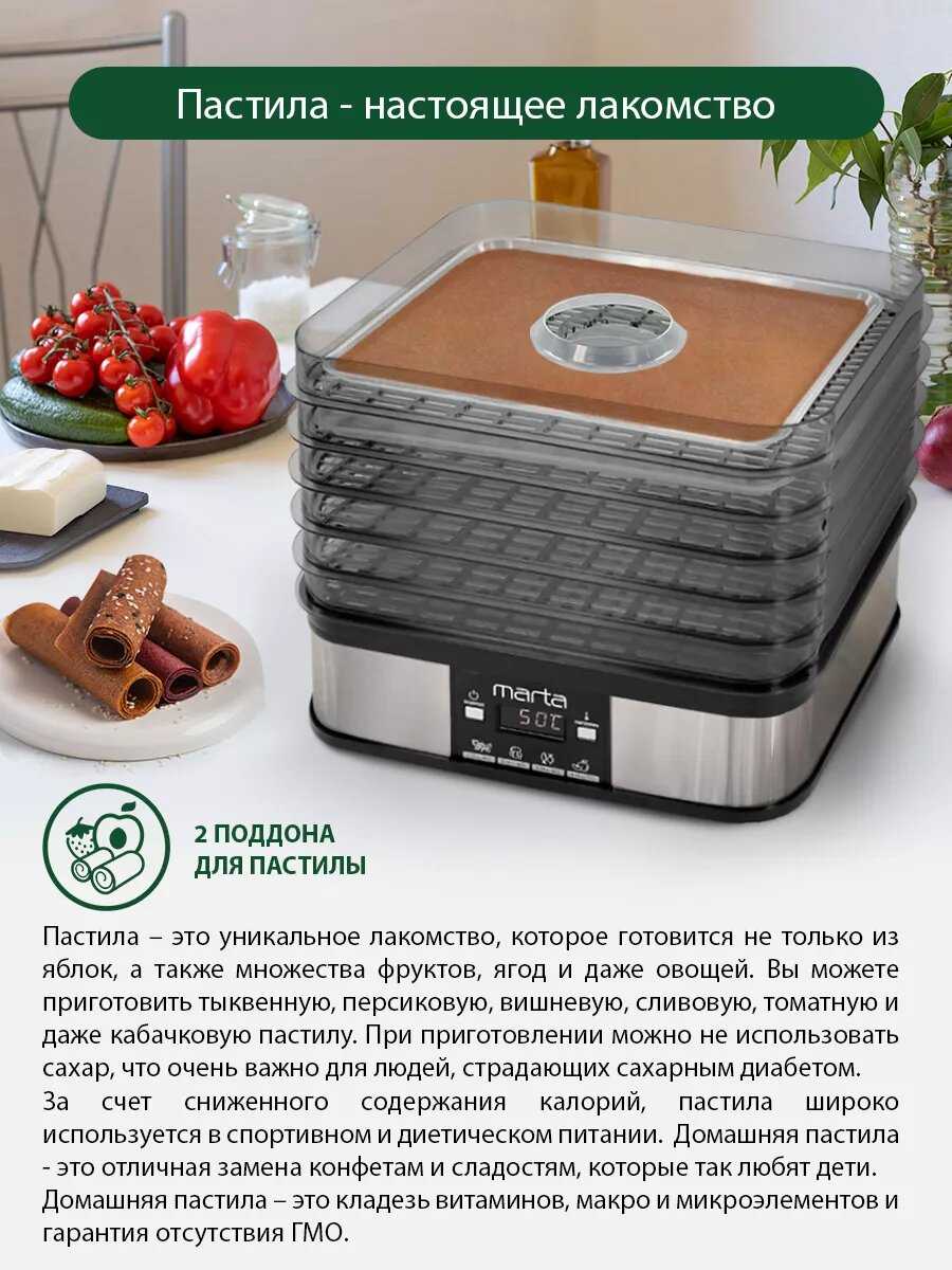 Производительность и эффективность сушки: Анализ отзывов показывает, что сушилка Marta демонстрирует неоднородные результаты в зависимости от типа продукта и его подготовки. Для фруктов, таких как яблоки сортов Голден и Грени Смит, а также для томатов, хурмы и зелени, устройство справляется эффективно, обеспечивая равномерное высушивание при условии периодического переставляния поддонов местами для компенсации неравномерного распределения температуры. Пользователи отмечают, что тонко нарезанные яблоки превращаются в чипсы с насыщенным вкусом, сохраняющим натуральность без добавления сахара. Однако для мяса, в частности говяжьего легкого, вымени или филе куриной грудки, результаты сильно зависят от толщины нарезки; при недостаточно тонких ломтиках вместо чипсов получаются вяленые кусочки, что указывает на ограниченную мощность нагревательных элементов. Время сушки варьируется от 8 часов для ягод и тонких фруктовых долек до 40 часов для более сочных или толсто нарезанных продуктов, что значительно превышает заявленные ожидания некоторых пользователей. Энергопотребление устройства оценивается как высокое, что является существенным фактором при длительных циклах работы. Приготовление пастилы занимает от 8 до 12 часов на нижних уровнях и до 12 часов и более на верхних, подтверждая необходимость ротации поддонов для достижения однородности.