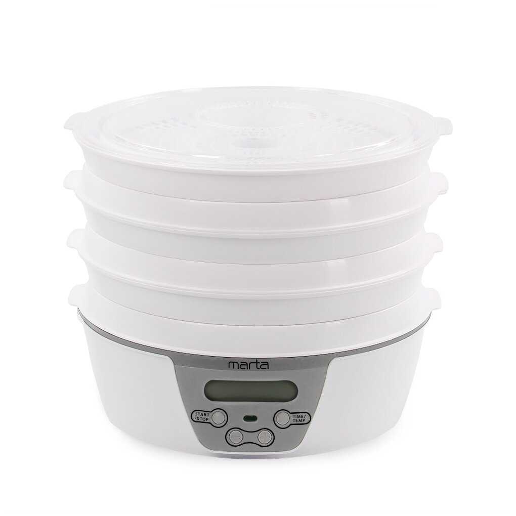 Сушилка многоярусная с несколькими поддонами для фруктов и овощей, плюс два специальных для пастилы, что позволяет сушить большие объёмы за раз. Пользователи хвалят вместимость: ведро грибов помещается, удобно для заготовок в поход или дома. Дополнительные поддоны расширяют возможности, но некоторым хочется ещё пару для пастилы. Поддоны пластиковые, легко моются вручную. Это делает её практичной для семейного использования. -