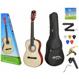 В комплекте : | Чехол для классической гитары размером 3/4, струны, ремень гитарный, каподастр, комплект медиаторов, машинка для накрутки струн. |