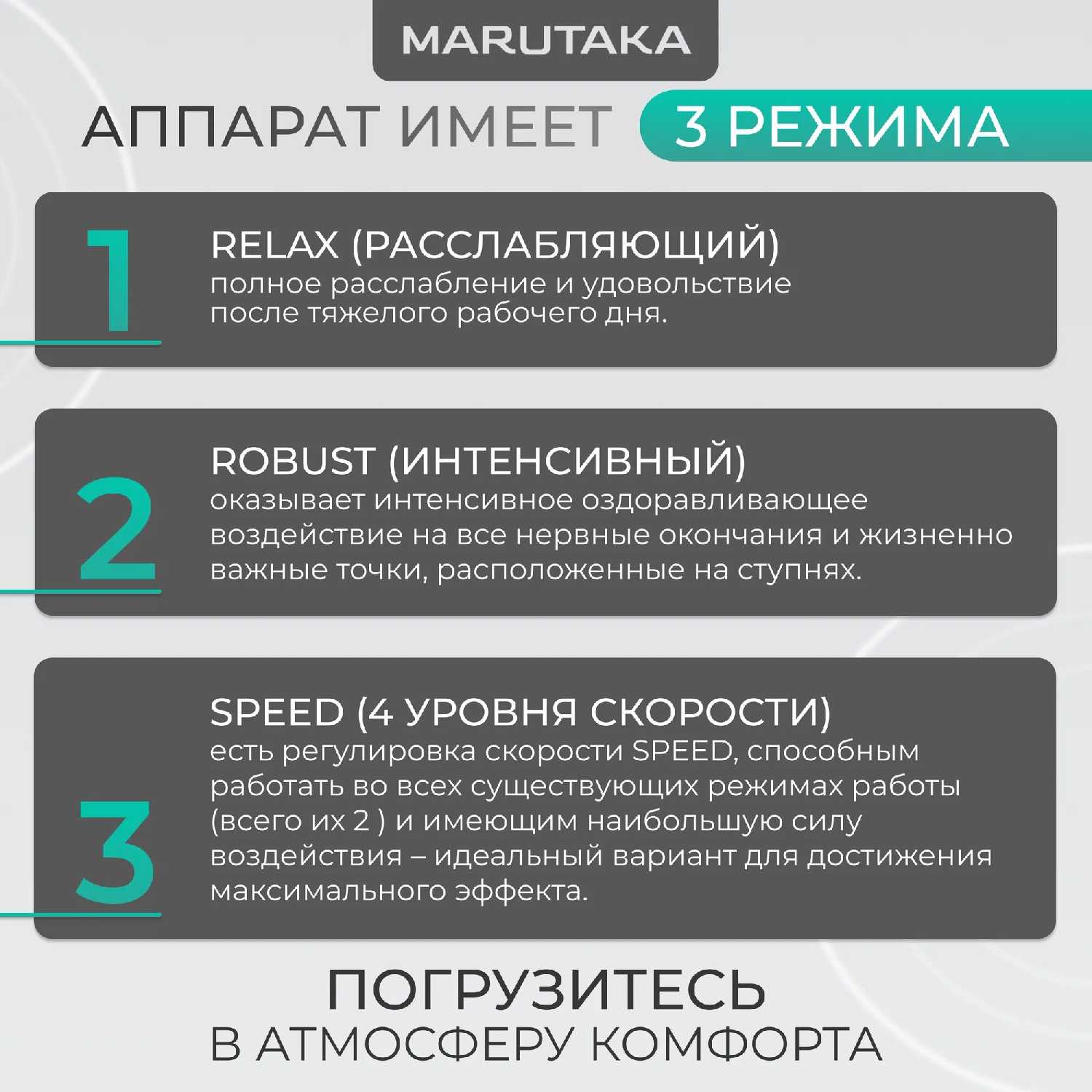 - + Очень хорошее устройство. Помогло мне избавиться от многолетнего болевого синдрома свода стопы( где подъем). Несколько вариантов скорости и времени. Программа Релакс и Робуст. Пользуемся с мужем с удовольствием. Надеваю хлопковые носки при использовании, как средство гигиены) Спасибо продавцу и Маркету!