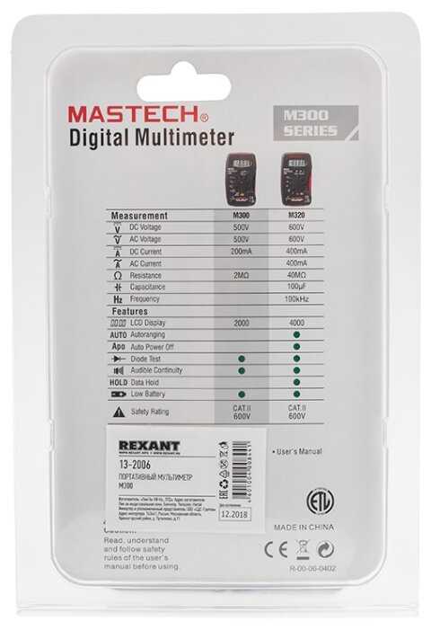 | Особенности : | защита от перегрузки, подсветка дисплея, фиксация измерений |