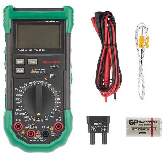 | Особенности : | автоматический выбор диапазона измерений, автоматическое выключение, подсветка дисплея, фиксация измерений |