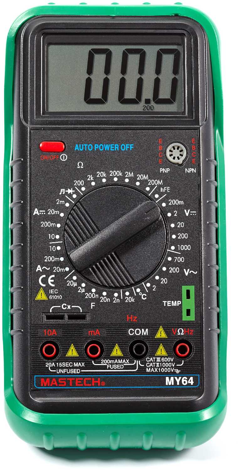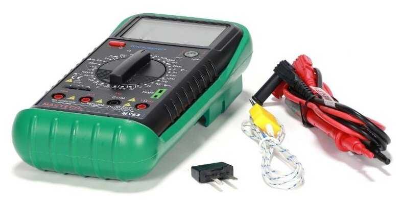 - Измеряет напряжение DC/AC, ток до 20 А, сопротивление, емкость до 20 мкФ, hFE транзисторов, температуру термопарой, частоту, НТС.