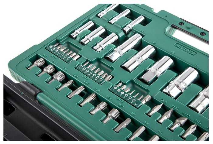 Хороший набор, состоит из 94 предметов, есть все самое необходимое для работы с авто по головкам/битам. Также имеется дополнительная свободная ниша, можно положить дополнительный инструмент или мелкие метизы. Набор компактный из крепкого пластика, места много не занимает, использую для самостоятельного ремонта автомобиля. Головки не трескаются, не сыпятся. Биты не сворачиваются. Использую не так часто, качеством доволен.
