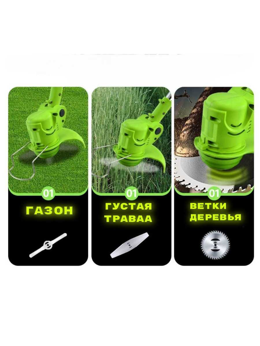 - В комплект входят различные насадки (металлический диск, пластиковые ножи), что позволяет выбрать оптимальный инструмент для типа растительности.