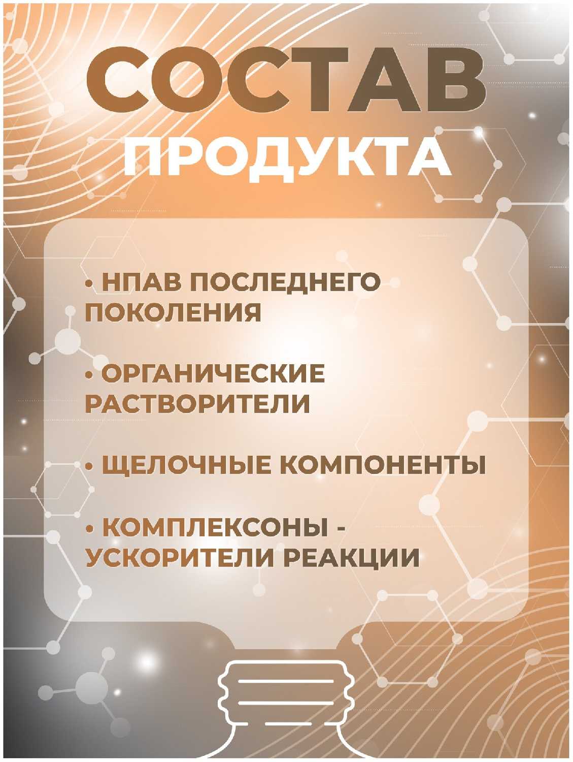 | Состав : | неионогенные и катионные ПАВ, щелочные компоненты, растворители, гликоли, комплексообразователи, вода. |
