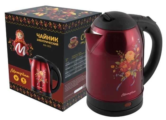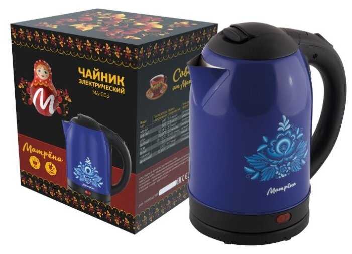 - + Чайник электрический Матрёна МА-005 2 л синий с красивым принтом. Индикация включения. Защита от включения без воды. Защита от перегрева. Автоотключение. Скрытый нагревательный элемент. Вращение на 360 градусов на подставке.Объём 2 литра нормально для семьи.