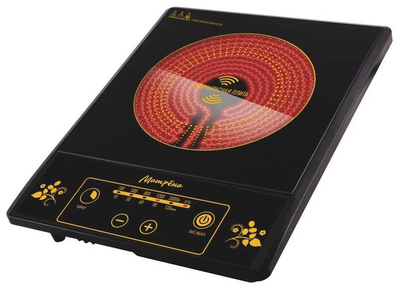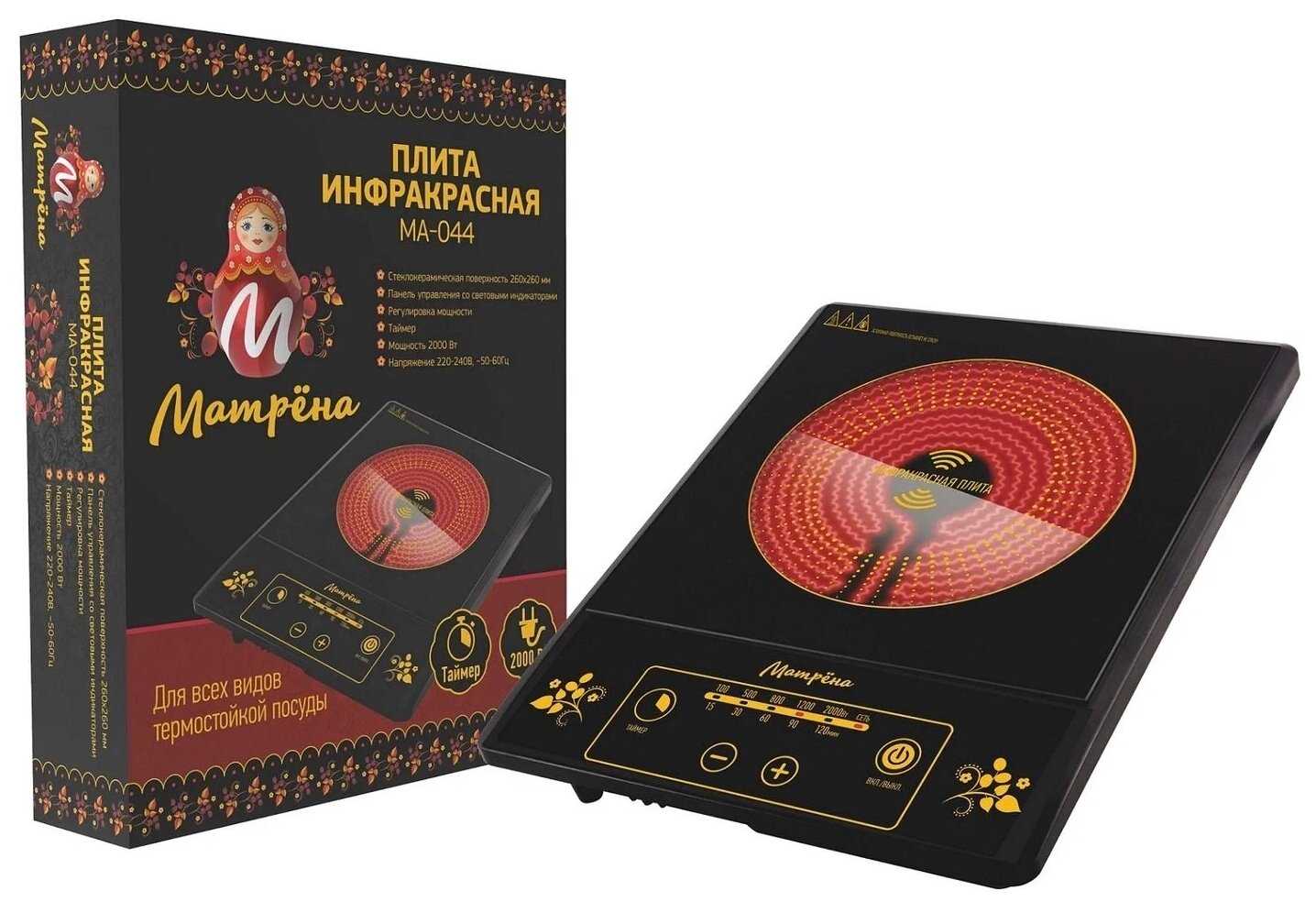 - Инфракрасный нагревательный элемент сохраняет эффективность без зависимости от типа посуды — подходит алюминий, керамика, стекло.
