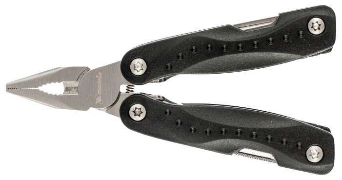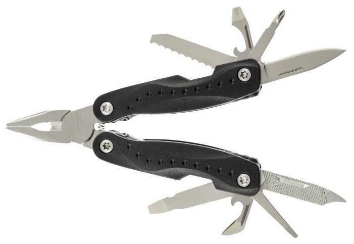 | Инструменты (функции) : | консервный нож, кусачки, нож, отвертка, открывалка для бутылок, пассатижи, пила, пилка для ногтей, плоскогубцы, шило / кернер |
