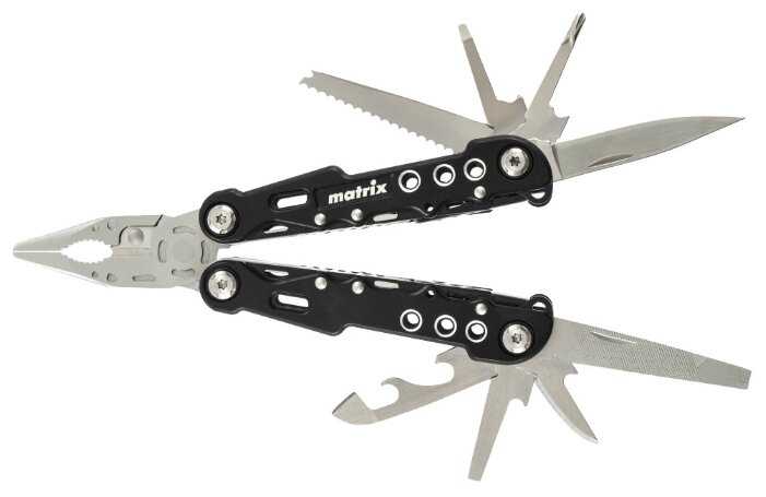 | Инструменты (функции) : | консервный нож, кусачки, линейка, напильник, нож, отвертка, открывалка для бутылок, пассатижи, пила, пилка для ногтей, плоскогубцы |