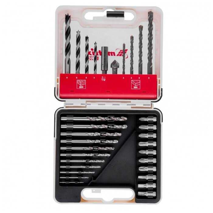 Отличный наборчик за свои деньги. влезли два конусных сверла того же производителя. Не хватило меньших диаметров по дереву, ибо для тех же чёрных саморезов 4мм многовато. Ну и вся оснастка, находящаяся на прозрачной крышке, плохо держится, но сверла за счёт своей длины возвращаются, а вот битодержатель и зенкер вылетают, если чемоданчик трехнуть