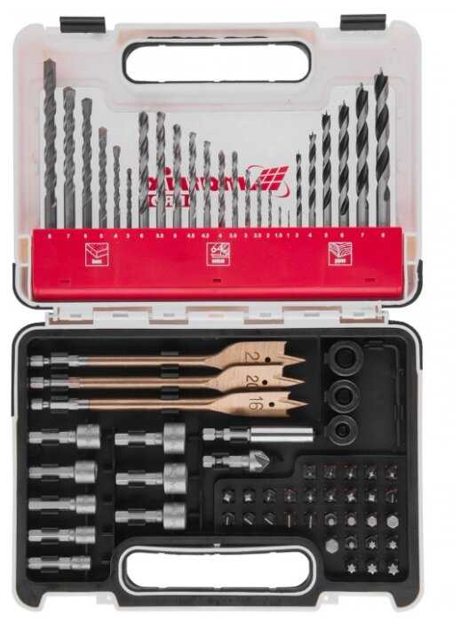 - Включает сверла по металлу, дереву и бетону, биты крестовые и плоские разных размеров, подходит для свертывания, откручивания и ремонта в гараже или дома.