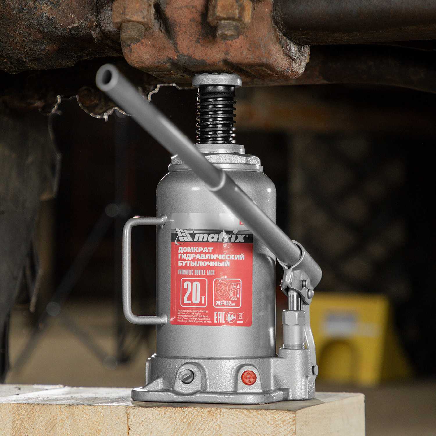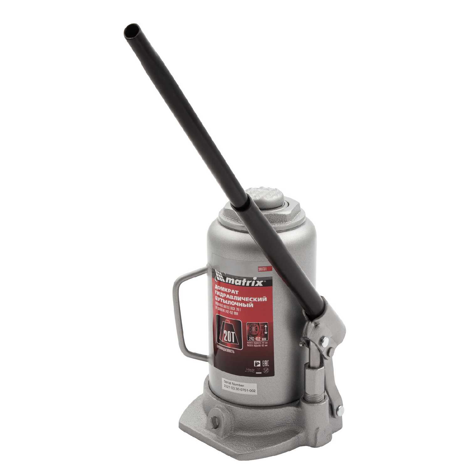 | Подробная комплектация : | Домкрат гидравлический бутылочный, 20 т, высота подъема 242-452 мм Matrix |