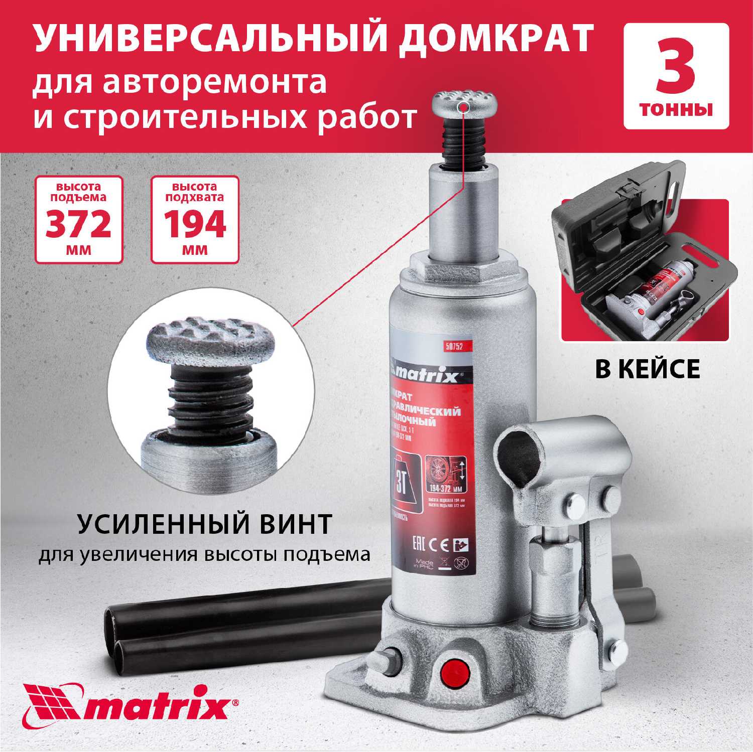 Отзывы о Домкрат бутылочный гидравлический Matrix Домкрат бутылочный гидравлический для мототехники (50752)