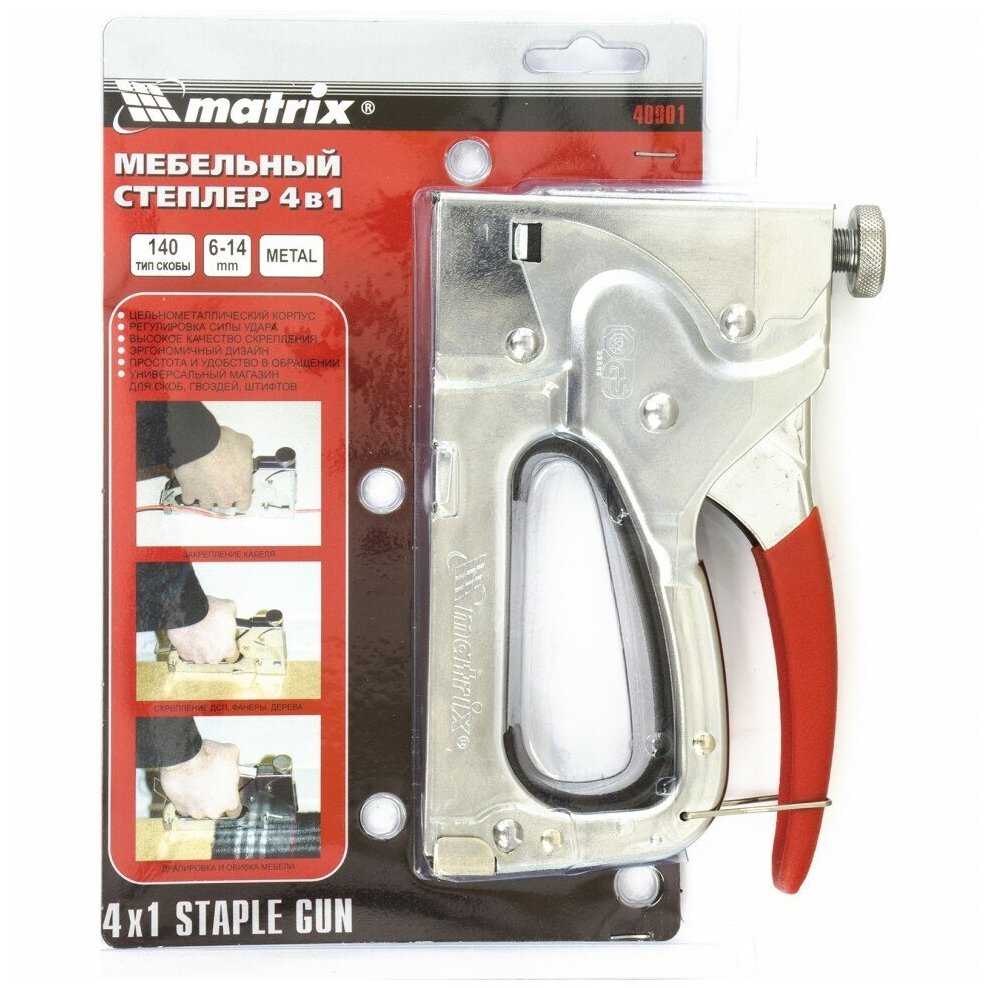 Дополнительная информация : | Четырехфункциональный мебельный степлер MATRIX MASTER 40901 имеет очень мощный универсальный механизм и регулируемую силу удара. Степлером можно выполнять операции четырьмя различными крепежами: скобы - 36, 140, гвозди - 300, штифты - 500. Инструмент обладает высоким рабочим ресурсом, что позволяет использовать его часто. |