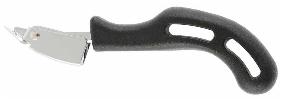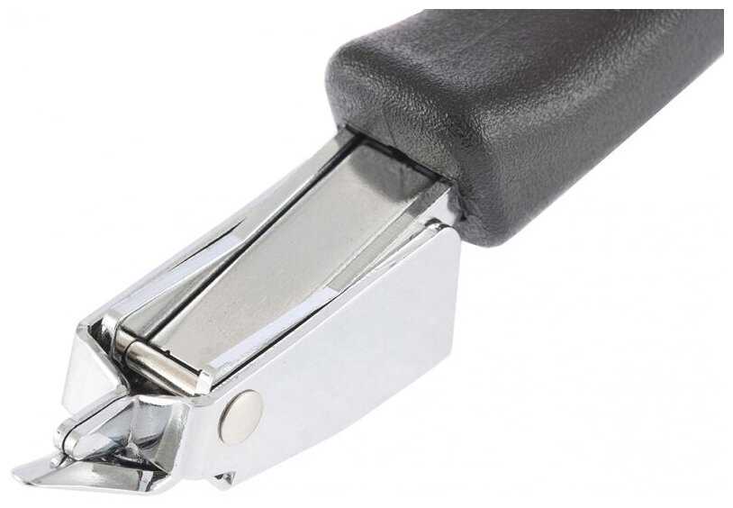 Инструмент рассчитан на работу преимущественно двумя руками. Основное действие – это рычажное: одной рукой (часто на рукоятке) пользователь фиксирует инструмент и создает точку опоры, а другой рукой (на рычаге) прикладывает усилие для извлечения скобы ("при поддевании..."). Работа одной рукой возможна на слабо засевших скобах, но для надежного извлечения, особенно тугих скоб, использование обеих рук более эффективно и безопасно для инструмента. -