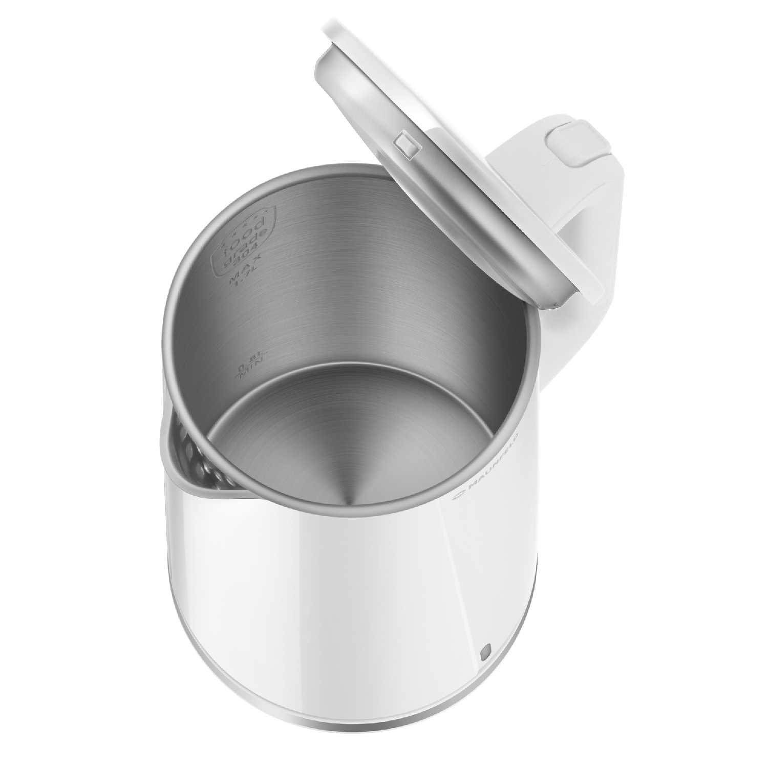 Воду кипятит быстро, звук при кипячении не слишком громкий. Корпус из нержавейки, красивый и практичный. Удобная ручка, не нагревается. Индикатор уровня воды хорошо виден.