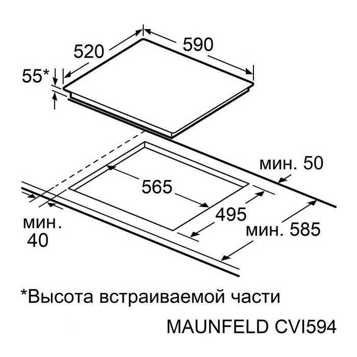 В комплекте только уплотнительная лента — крепежные скобы отсутствуют. Для фиксации в столешнице требуются дополнительные зажимы. Кабель питания короткий (85 см), без вилки, что требует подключения через клеммную колодку или покупки силовой вилки. Минимальный зазор для вентиляции — 4 см под столешницей.