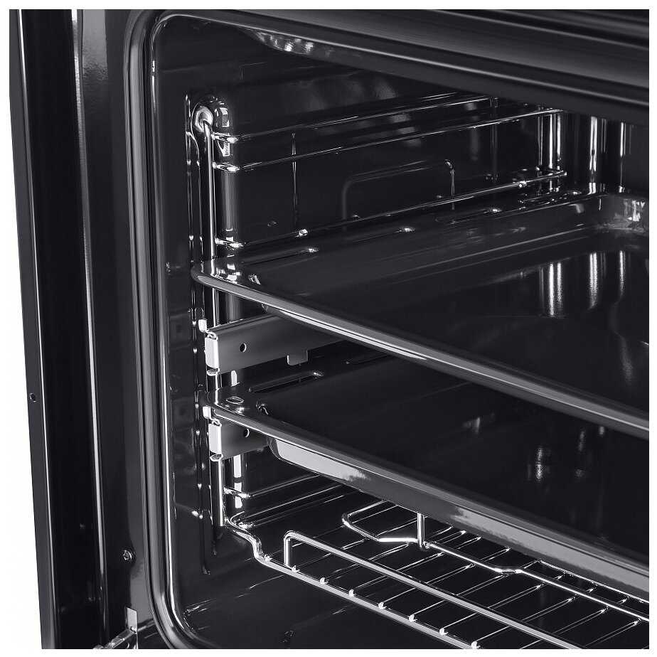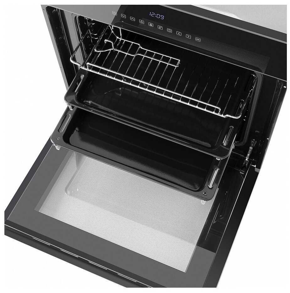 Шкаф много функциональный, имеет в комплекции два противня, решётку, оснащён телескопическими направляющими. Есть гриль, разморозки, таймер., большой дисплей. Очень красивый внешне.