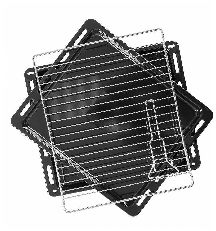 Шкаф много функциональный, имеет в комплекции два противня, решётку, оснащён телескопическими направляющими. Есть гриль, разморозки, таймер., большой дисплей. Очень красивый внешне.
