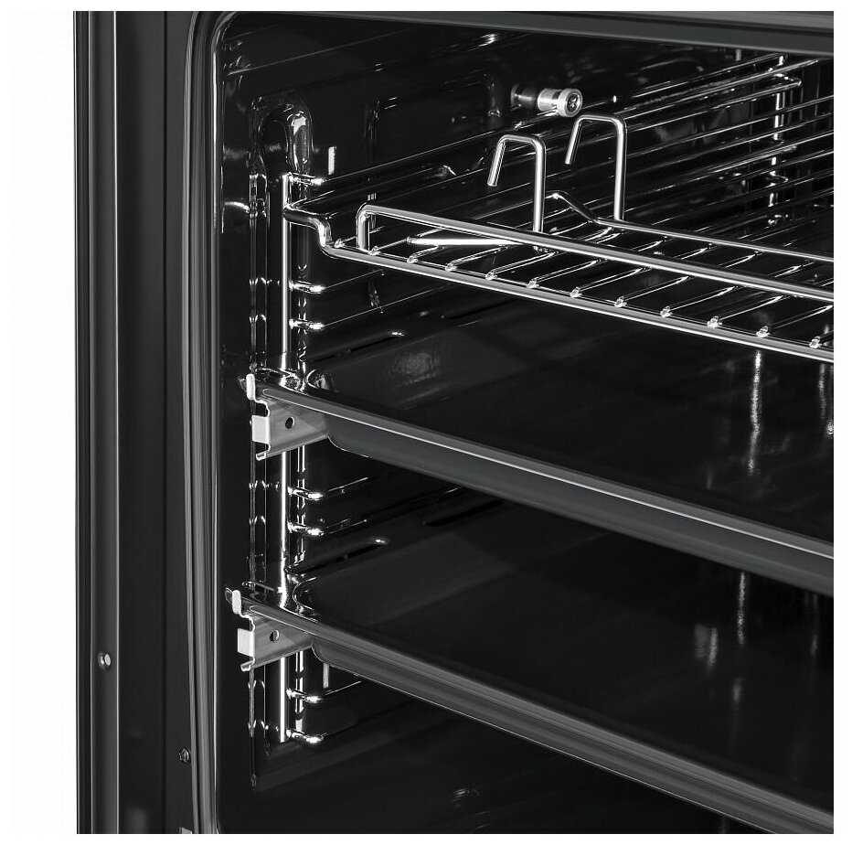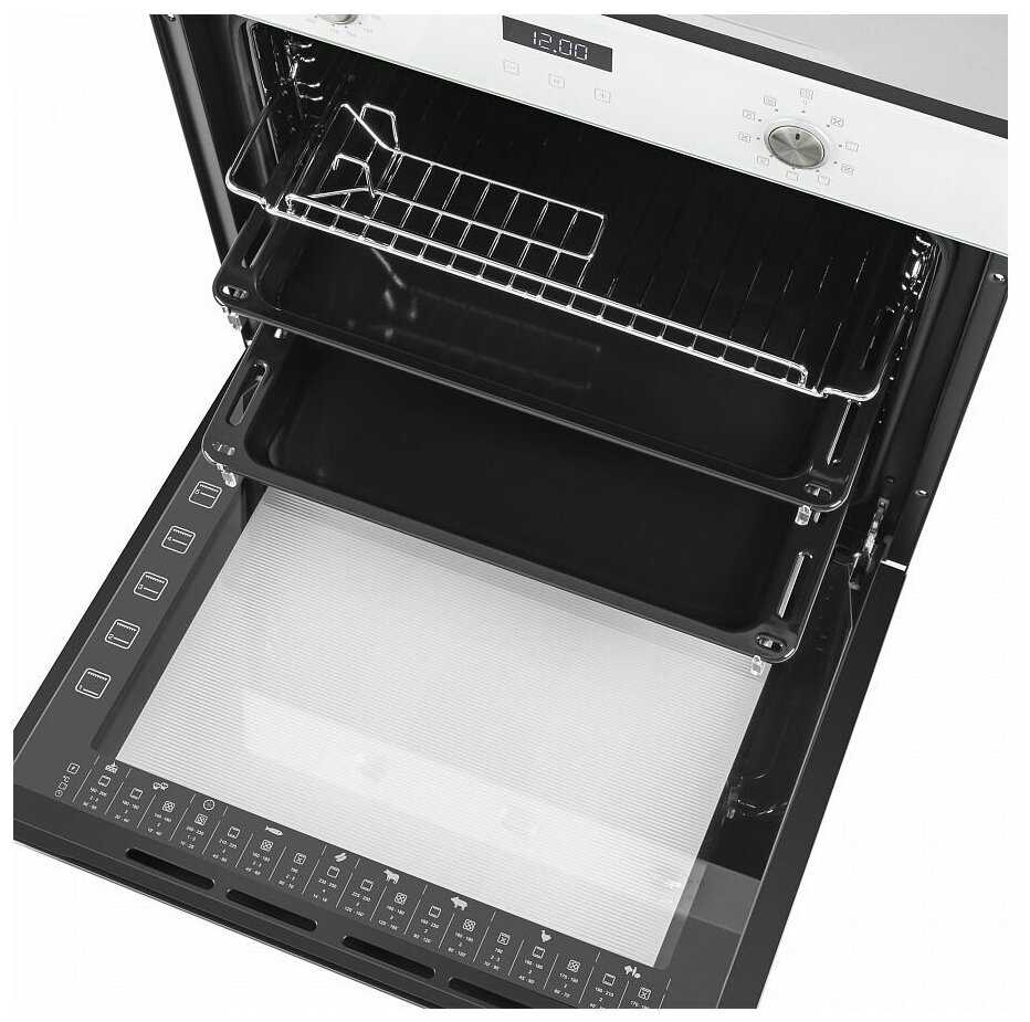 2 уровня телескопических направляющих, противень не вываливается при выдвигании. За такую цену - очень достойный вариант. Направляющие для противней 6 уровней. Дверца шкафа 3-х стекольная, медленно нагревается, что исключает возможность ожога, полезно особенно, у кого маленькие детки. Очень большой объем камеры - 76 л! Есть очень удобный таймер, и цифровой дисплей. Можно задать продолжительность готовки, через которое духовка выключится, и смотреть, сколько еще осталось.