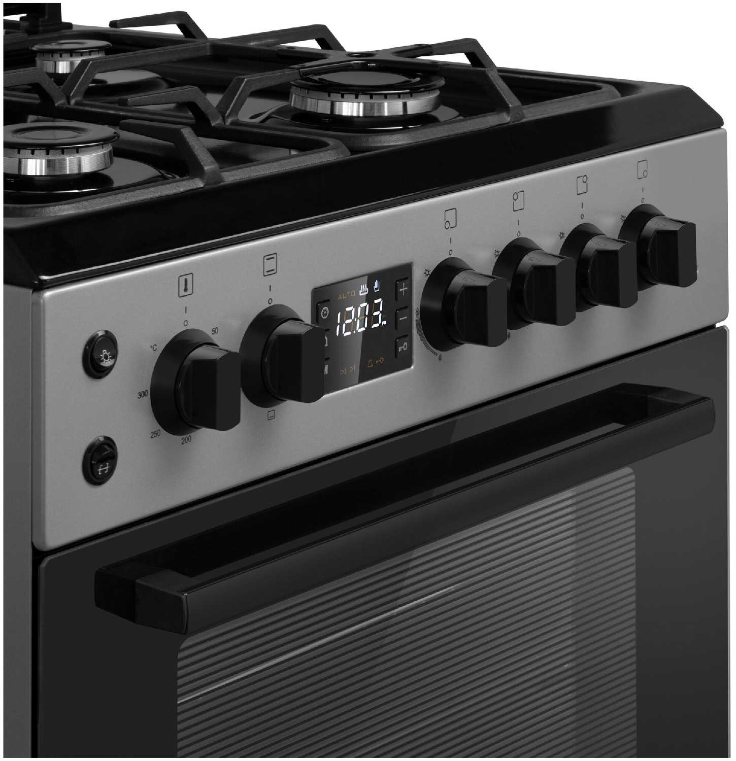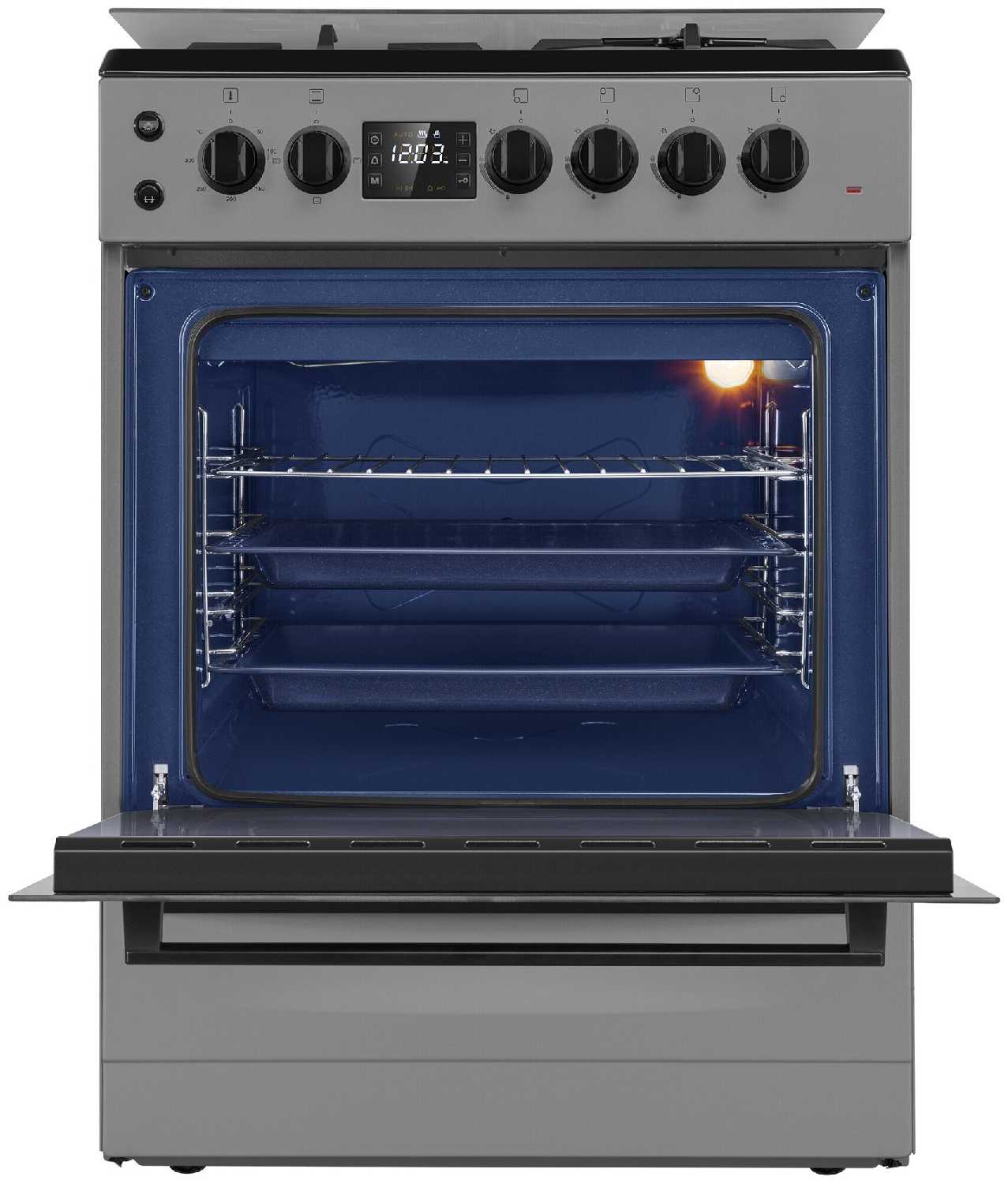 Максимальная температура духовки — 300°C, что достаточно для большинства рецептов, но пользователи отмечают несоответствие заданной и реальной температуры: приходится «докручивать» настройки. Конфорки варочной панели, включая экспресс-режим, быстро нагреваются, однако в некоторых моделях отсутствуют заявленные двойная или тройная «короны», что ограничивает регулировку пламени. Чугунные решётки выдерживают тяжёлую посуду, но их вес усложняет чистку. Электрическая духовка оснащена двумя противнями и решёткой, что позволяет готовить на разных уровнях. Подсветка работает стабильно, но отсутствие индикации текущей температуры на дисплее раздражает часть пользователей. Размеры плиты (60 см в ширину) подходят для просторной кухни, обеспечивая место для крупной посуды. Отдельный ящик для хранения — приятный бонус для тех, кто ранее пользовался моделями без этой опции.