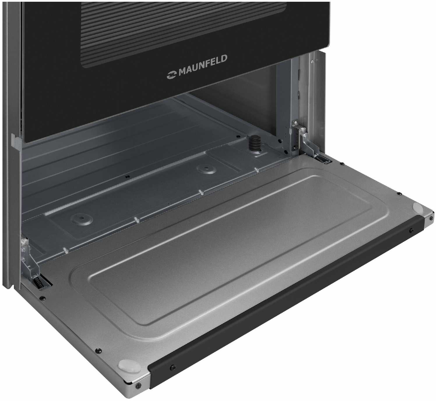 Плита Maunfeld демонстрирует высокую функциональность благодаря комбинированной конструкции: газовая варочная панель с четырьмя конфорками разной мощности и электрическая духовка объёмом 50–65 литров. Пользователи отмечают чугунные решётки, которые обеспечивают устойчивость посуды и долговечность. Электрическая духовка оснащена верхним, нижним и комбинированным нагревом, грилем, конвекцией и вертелом, что позволяет равномерно запекать блюда. Таймер оповещает об окончании готовки, но не отключает нагрев автоматически — это вызывает недовольство у части пользователей. Электроподжиг и газ-контроль повышают безопасность, особенно для семей с детьми: газ подаётся только при нажатии кнопки, что исключает случайное включение. Однако некоторые столкнулись с трудностями при розжиге — например, одна конфорка может не срабатывать из-за проблем с проводкой. Гидролизная очистка духовки и керамическое покрытие упрощают уход, но резиновые уплотнители на дверце иногда проклеены неаккуратно, что влияет на герметичность.