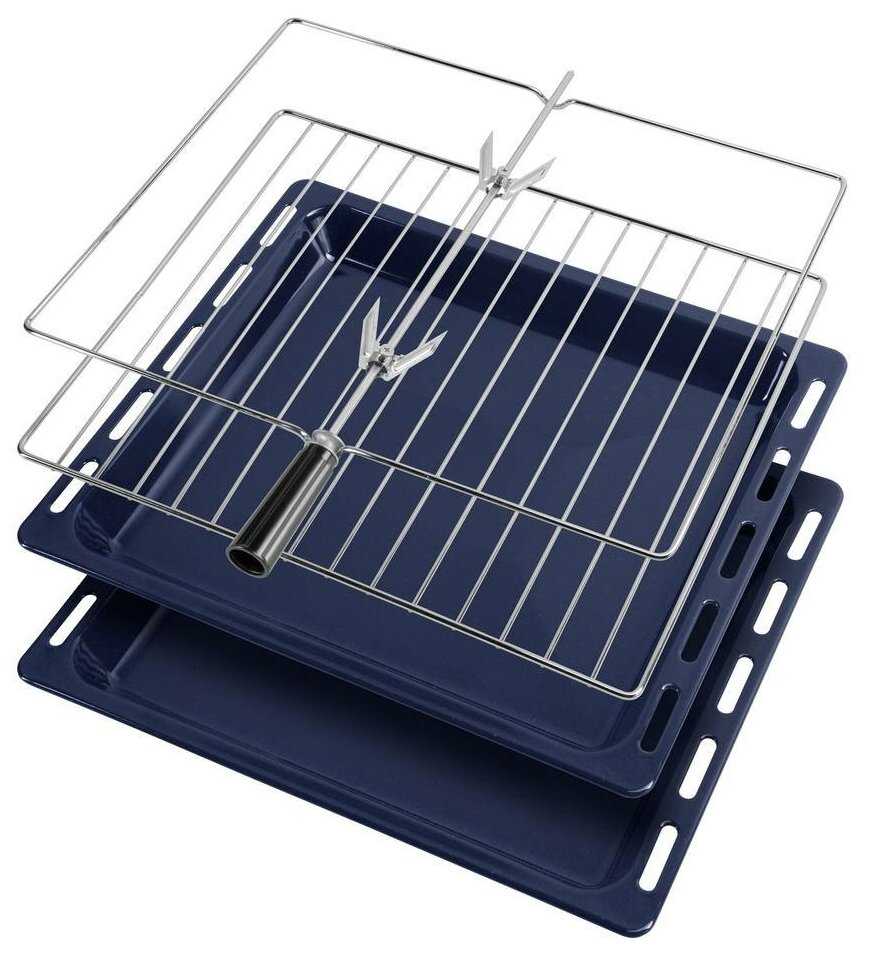Стандартная поставка включает два противня (плоский и глубокий), решетку для гриля, вертел и чугунные решетки для варочной панели. Некоторые пользователи получили дополнительные жиклеры для сжиженного газа. -