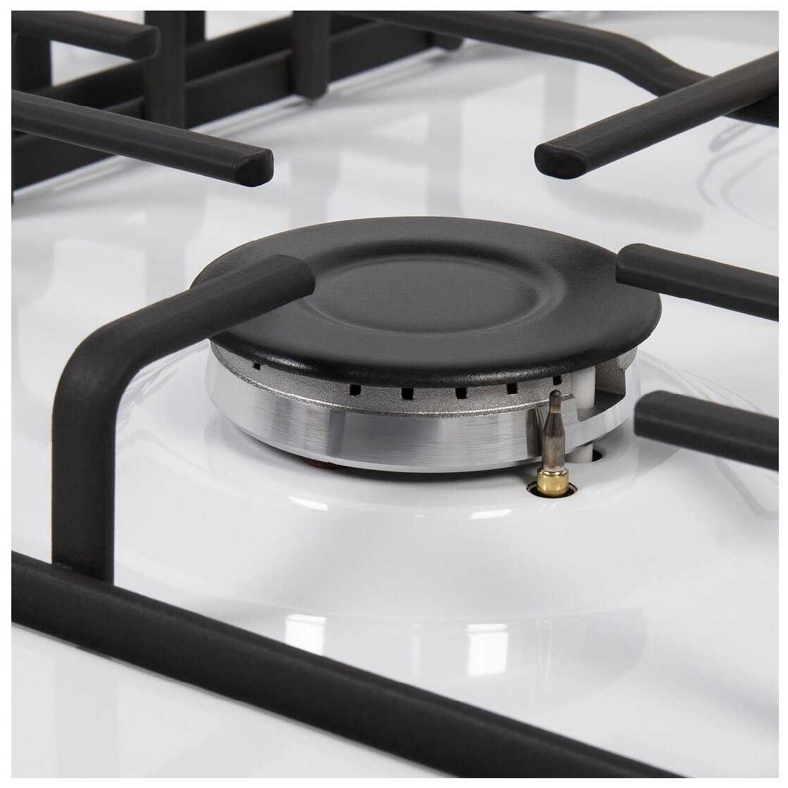 - - одна из ручек повреждена, основание кривое, ручка смотрит в бок. Большая горелка на минимуме сильно свистит