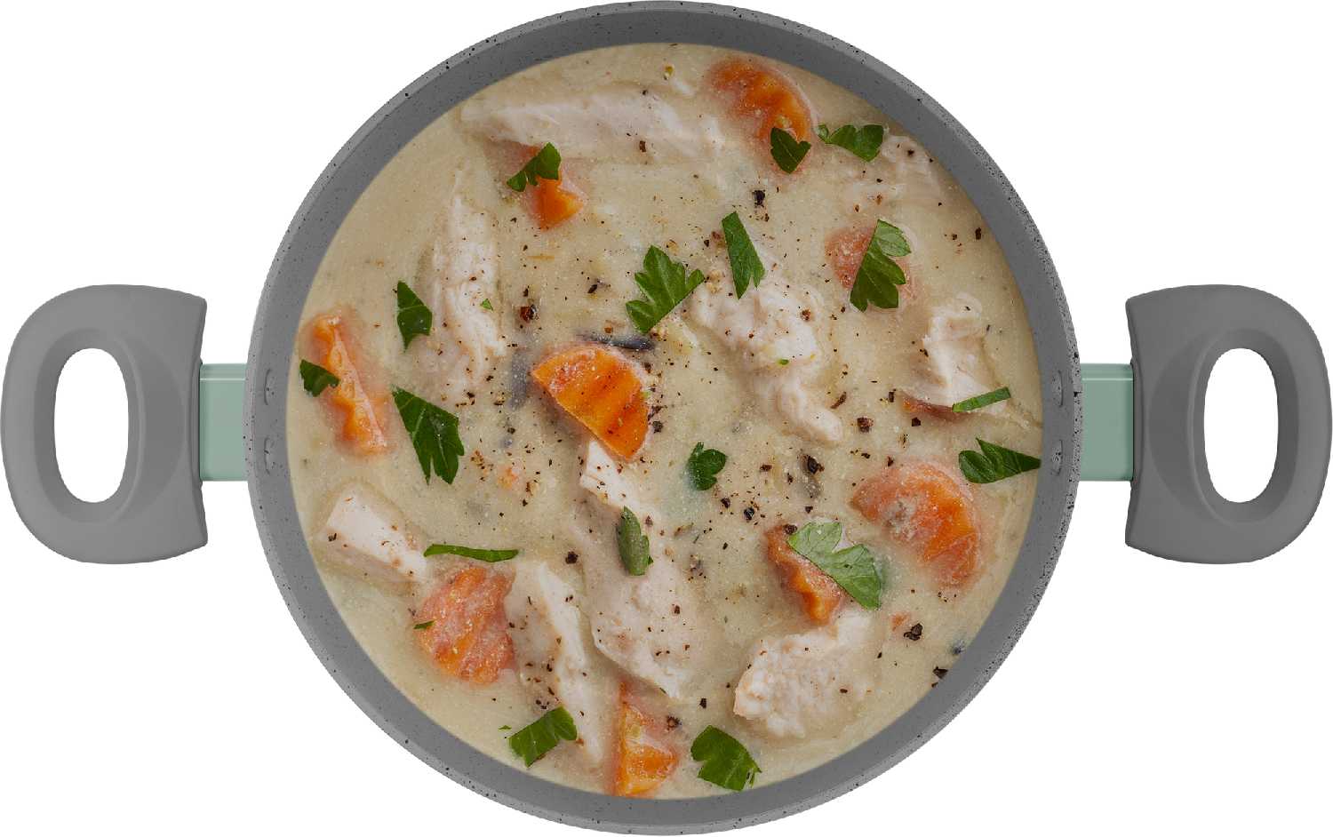 Объема кастрюли вполне достаточно для приготовления еды на семью из 4 человек. Внутреннее покрытие кастрюли выполнено из антипригарного материала, что позволяет использовать минимальное количество масла при готовке и облегчает процесс мытья.