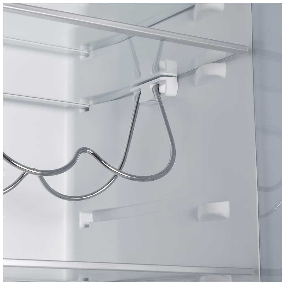 Внутреннее пространство продумано рационально: включает минимум четыре прочные стеклянные полки с металлической окантовкой, которые выдерживают вес кастрюль и крупных банок с консервацией. Полки переставляются по высоте для адаптации под высокую посуду. Дополнительно предусмотрены два глубоких выдвижных ящика для овощей/фруктов, зона свежести, решетка для бутылок, два лотка для яиц и пять регулируемых полок на дверце для емкостей разной высоты. -