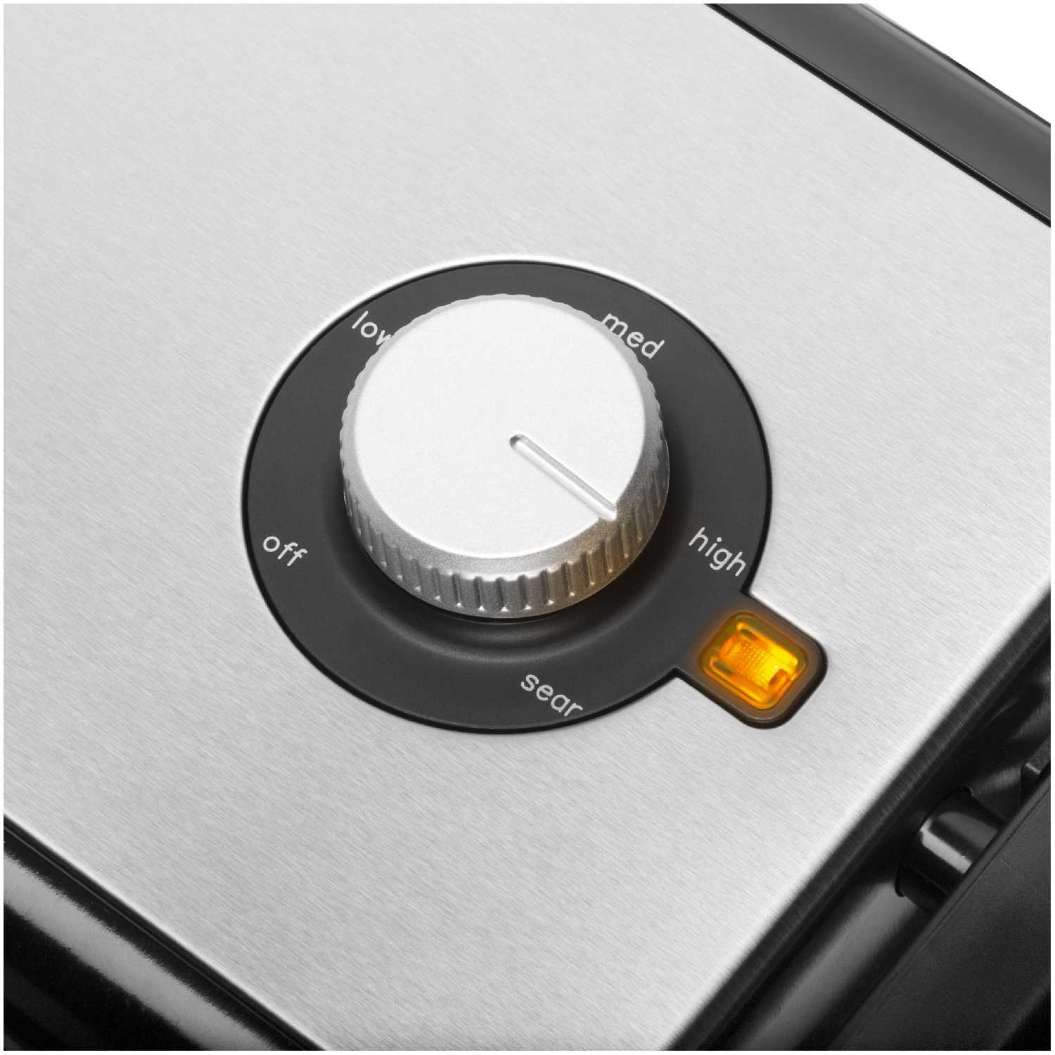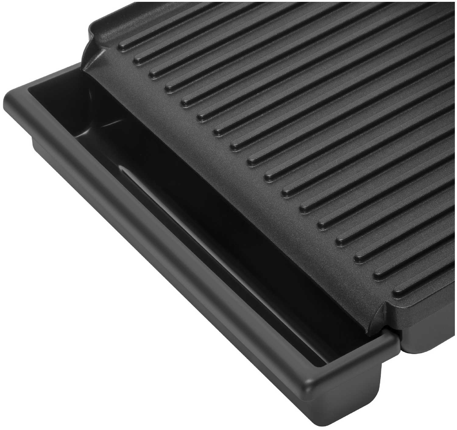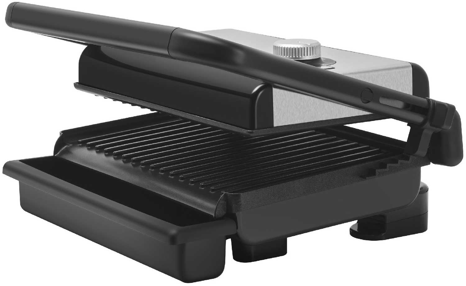 - + Современный электрический гриль из нержавеющей стали с 4 режимами работы. Съемный поддон для сбора жира и панели с антипригарным покрытием.