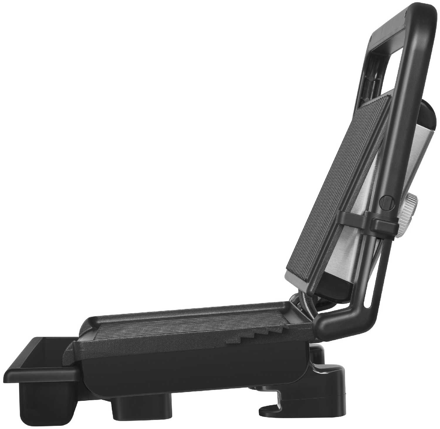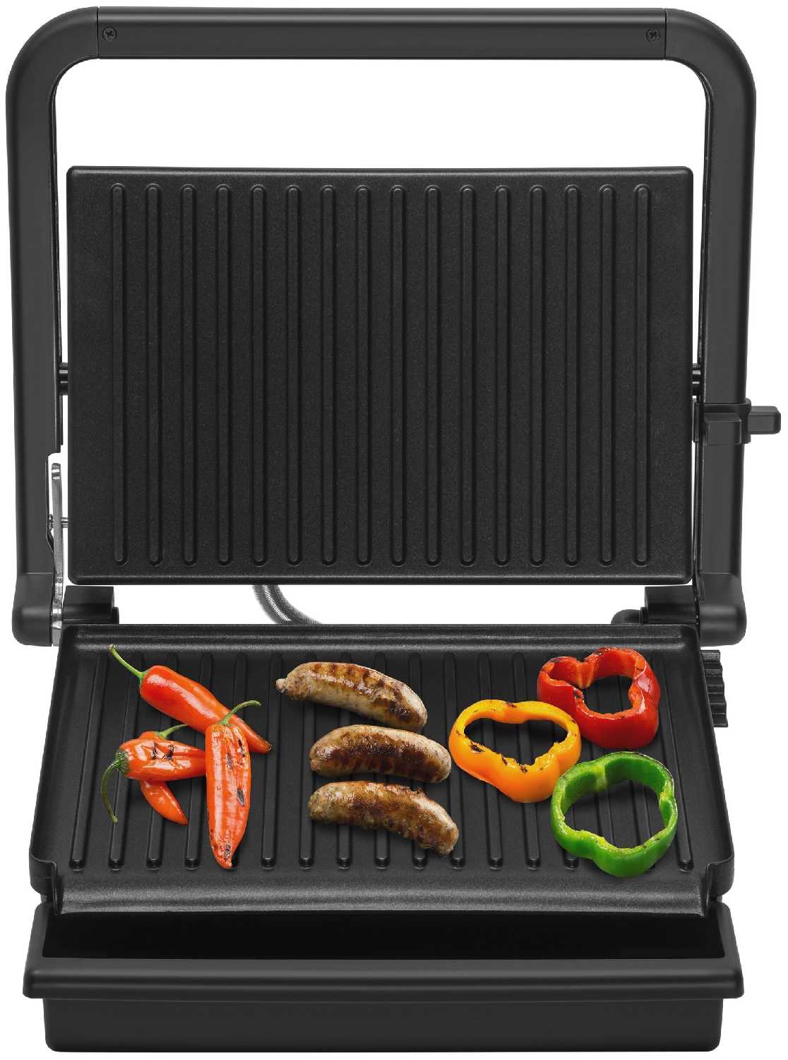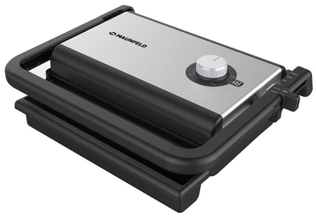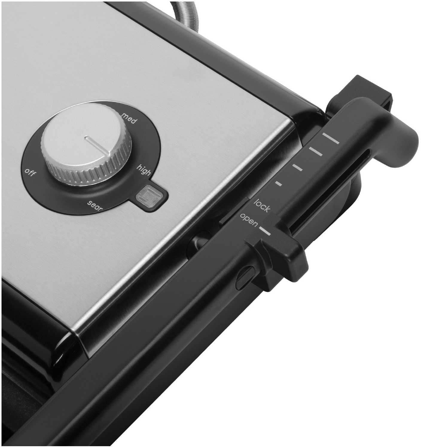 - + Современный электрический гриль из нержавеющей стали с 4 режимами работы. Съемный поддон для сбора жира и панели с антипригарным покрытием.