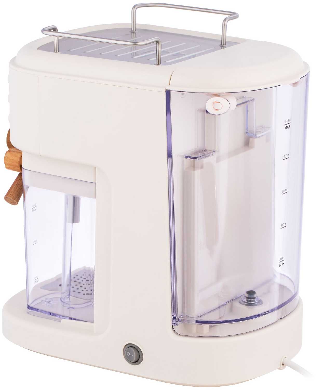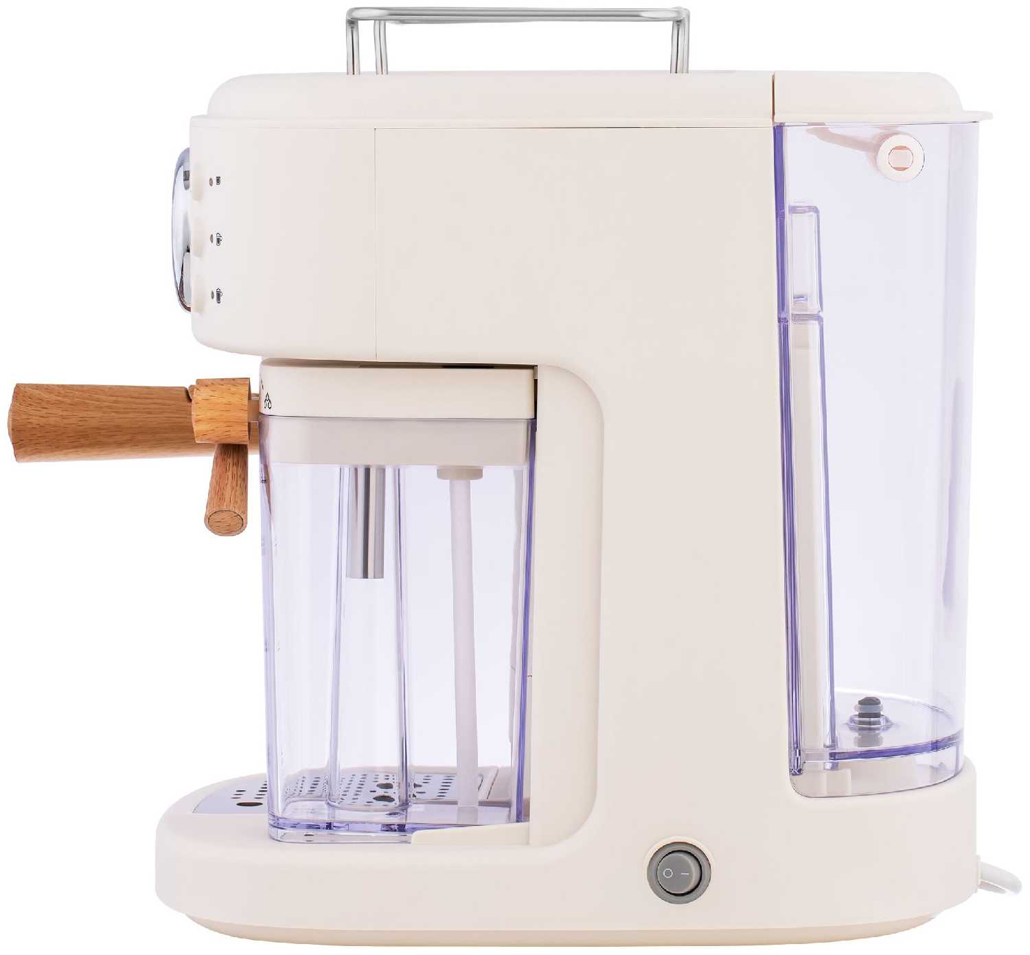 - + красивый ретро дизайн, выполнил в бежевом цвете, очень удобно быстро варит кофе, довольно тихая не мешает когда утром делаем кофе бак для молока и воды довольно большие. очень красивый манометр на лицевой части кофеварки. рожок легко вставляется и вынимается оттуда. есть два сменных фильтра, что очень удобно. кофе получается очень вкусный