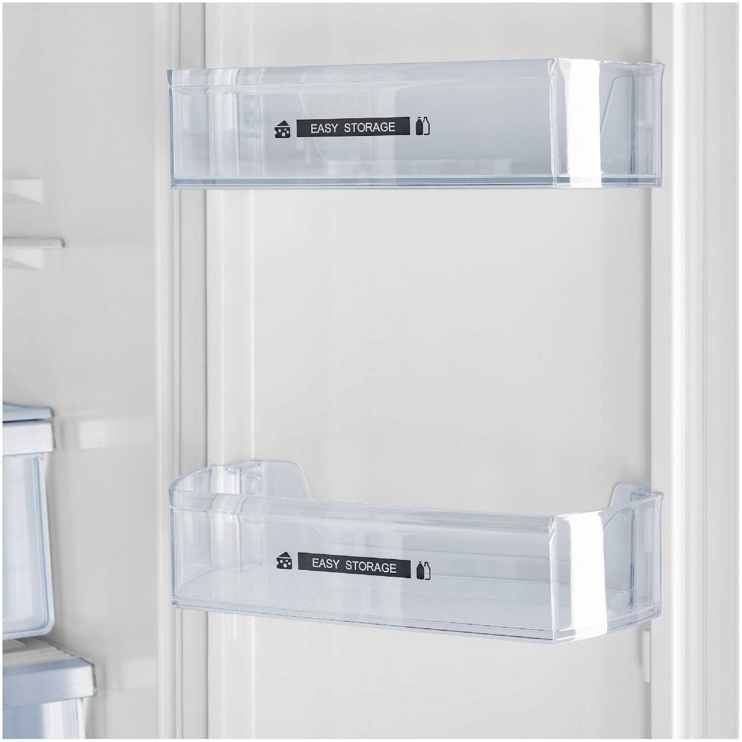 - Закрываемые полки на дверце, множество отделений и ящиков для организованного размещения продуктов.