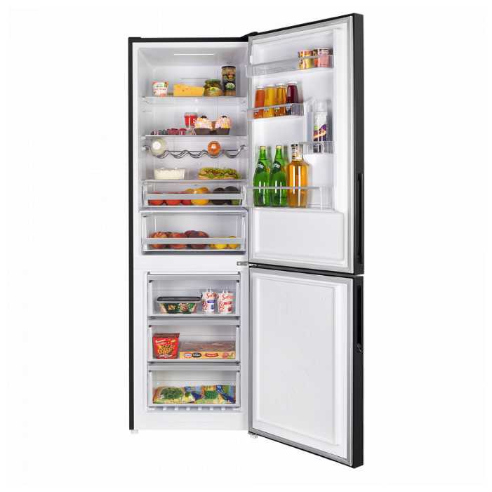 Внутри холодильника есть множество полок и отделений для хранения различных продуктов, а также зона свежести для овощей и фруктов. Морозильная камера оснащена тремя вместительными ящиками для хранения замороженных продуктов.