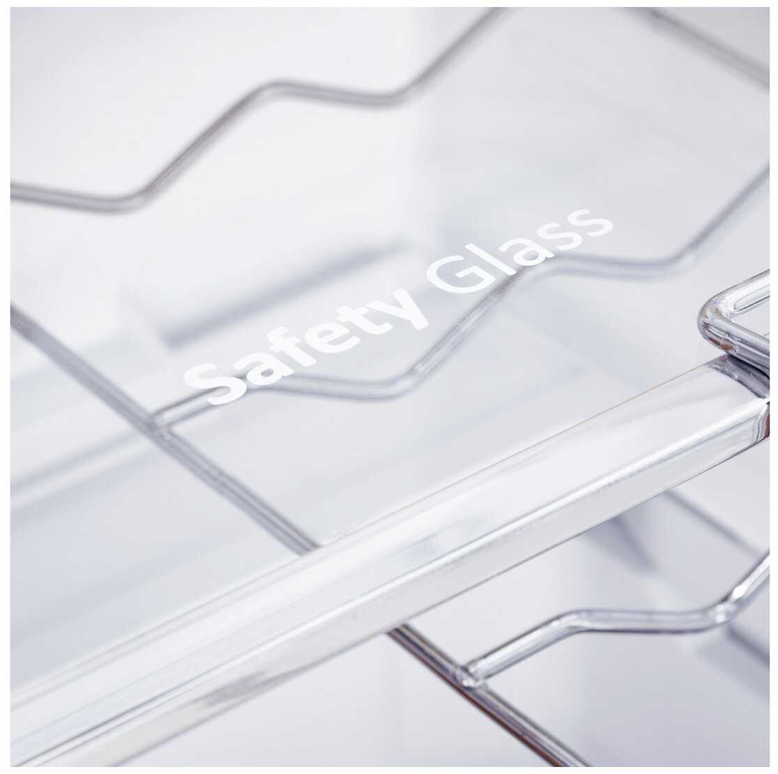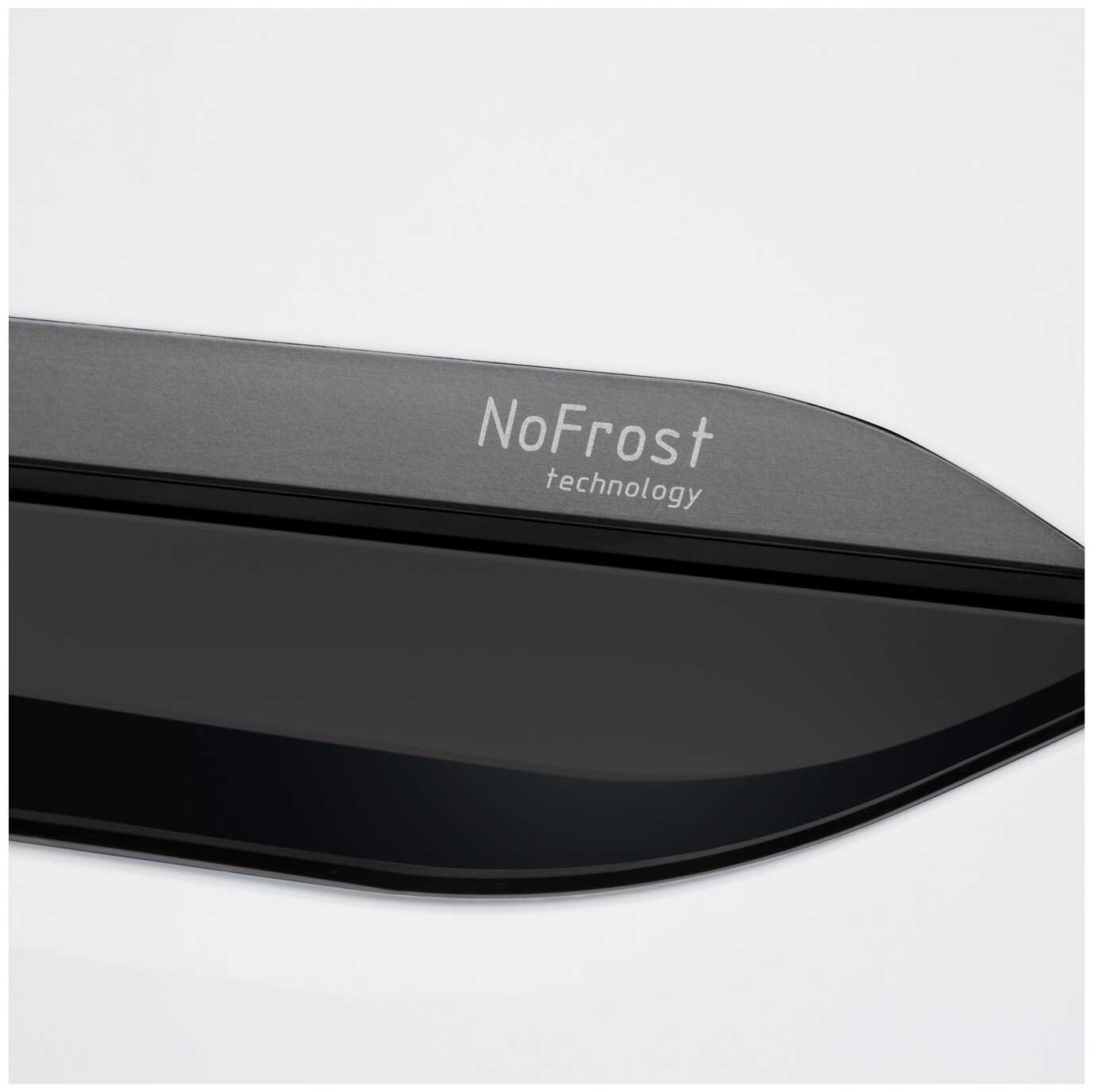 Внутри холодильника есть четыре стеклянные полки, которые можно регулировать по высоте. Также имеется два ящика для хранения фруктов и овощей. Система No Frost предотвращает образование льда и инея, что облегчает уход за холодильником.