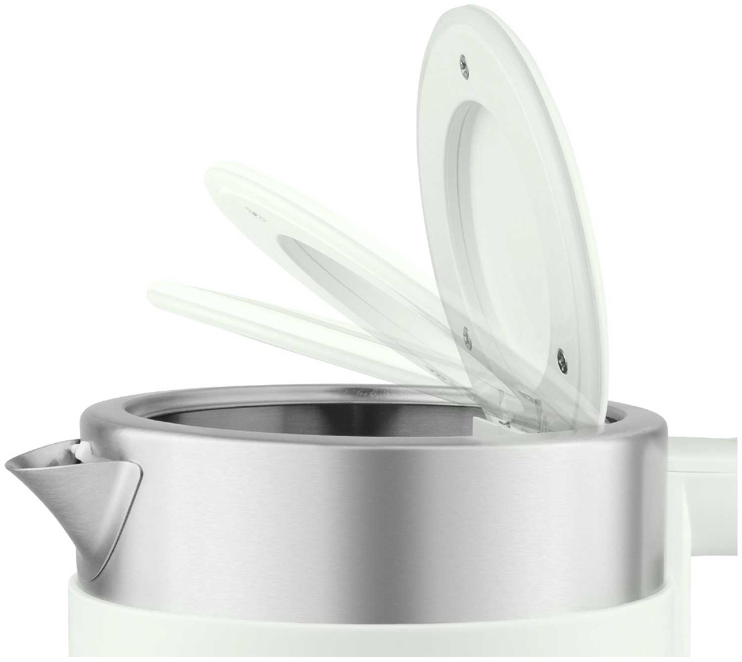 - Автоматическое открытие крышки, эргономичная ручка и индикатор уровня воды (прозрачная шкала с метками) делают эксплуатацию интуитивной.