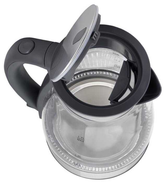 - Стеклянная колба позволяет видеть уровень воды и процесс кипения.
