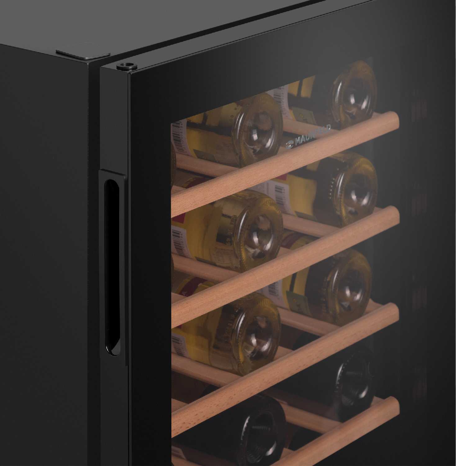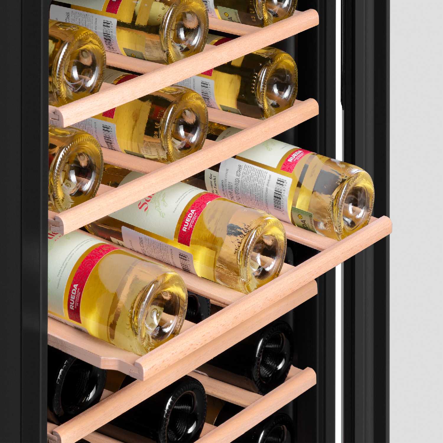 - Полки из натурального бука имеют специальные ложбинки, предотвращающие скатывание бутылок и обеспечивающие их безопасное размещение.