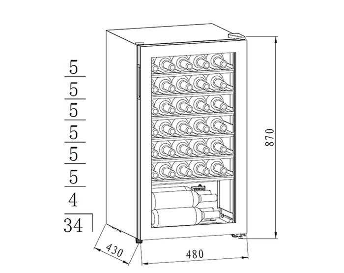 - Конфигурация из пяти съемных деревянных полок позволяет гибко настраивать высоту секций под бутылки различного формата, включая магнумы 1,5 л.