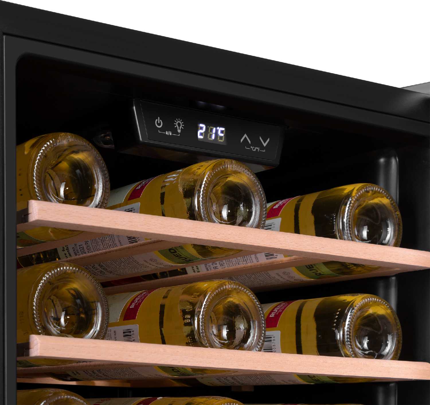 - Дверца с тонированным стеклом эффективно блокирует ультрафиолетовое излучение, предотвращая деградацию вина от солнечного света.